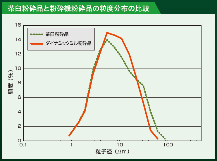これは茶臼200~250台分の生産能力に相当します。また、粉砕品の粒度分布や形状も茶臼で粉砕した抹茶とほぼ同等です。粉砕中の温度も低く抑えることができますので、風味の劣化を極力抑えることができます。