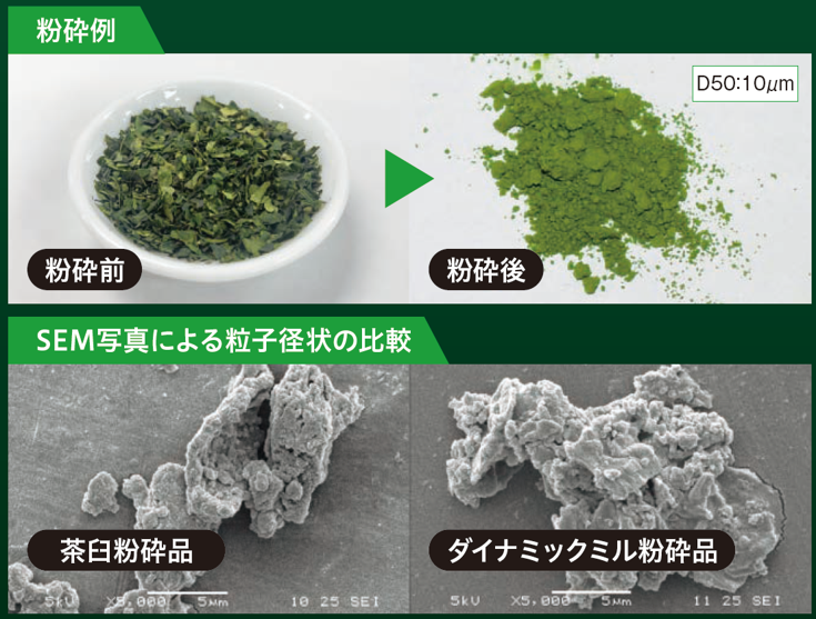 長年培ってきた乾式粉砕技術を応用し、茶葉粉砕に特化した粉砕機を開発しました。1989年に1号機を納品してからこれまで、京都、静岡をはじめとする老舗製茶メーカに多数採用いただき、ご評価いただいております。茶葉の色味、風味、粒径は石臼レベルそのままに、生産能力は石臼の200~250倍を実現しています。長年培ったノウハウをもとにご要望の茶葉に適した粉砕条件をご提案し、幅広いラインナップから生産量に合わせた型式をご提案します。設備の自動化もお任せください。