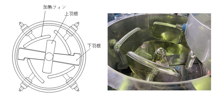 「FDミキサ」は、飛沫同伴の防止と大きな伝熱面積を確保するために、「FMミキサ」よりも混合槽のL/Dを小さくしています。FDミキサの撹拌羽根は、槽内壁部での粉末の流動性向上、ダンゴ状材料の解砕と乾燥過程での強固な状態で過度な動力を要しない事を目的とした形状です。この度開発した「FDミキサ乾燥装置」では、混合槽内に、温水、スチームや熱媒油を通した「加熱フィン」を配置しました。加熱フィンの伝熱面積も増えるため乾燥能力の向上が見込まれます。