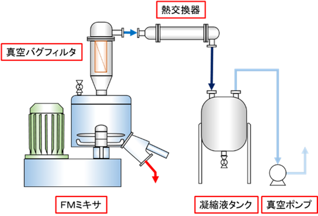 「FMミキサ乾燥装置」は、混合槽内を減圧し、ジャケットに温水、スチームや熱媒油を通し、混合槽内に投入した材料を撹拌しながら加熱し乾燥する機構です。蒸発した水分は熱交換器を通して凝縮液タンクで液体として回収できます。材料を撹拌しながら乾燥するので、伝熱の向上も寄与し工程の短縮が見込まれます。また、流動化により巻き込まれた空気がキャリアガスとして働くので、減率乾燥期間での乾燥を促します。